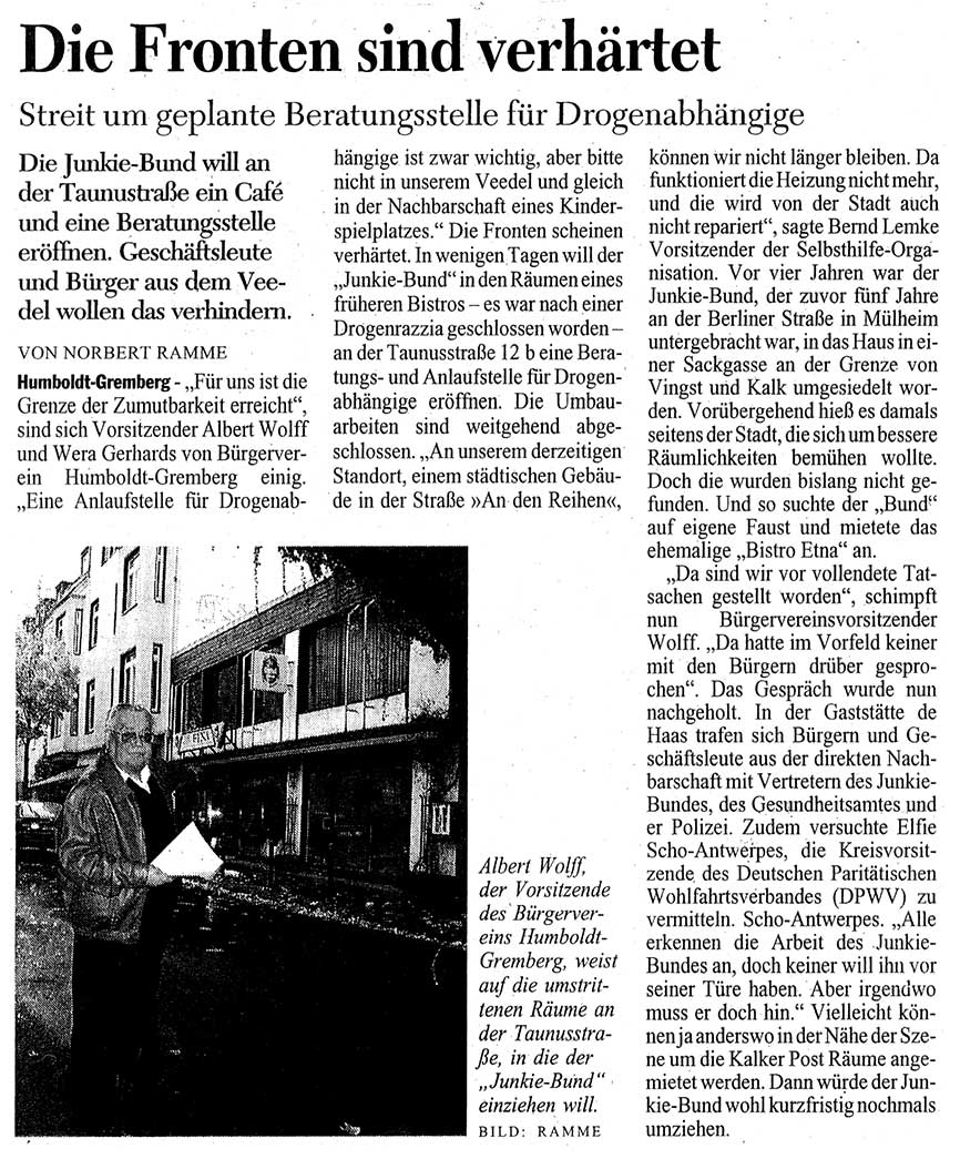 „Da sind wir vor vollendete Tatsachen gestellt worden“, schimpft nun Bürgervereinsvorsitzender Wolff. „Da hatte im Vorfeld keiner mit den Bürgern drüber gesprochen“. Das Gespräch wurde nun nachgeholt. In der Gaststätte de Haas trafen sich Bürgern und Geschäftsleute aus der direkten Nachbarschaft mit Vertretern des Junkie-Bundes, des Gesundheitsamtes und er Polizei. Zudem versuchte Elfte Scho-Antwerpes, die Kreisvorsitzende, des Deutschen Paritätischen Wohlfahrtsverbandes (DPWV) zu vermitteln. Scho-Antwerpes. „Alle erkennen die Arbeit des Junkie-Bundes an, doch keiner will ihn vor seiner Türe haben. Aber irgendwo muss er doch hin.“ Vielleicht können ja anderswo in der Nähe der Szene um die Kalker Post Räume angemietet werden. Dann würde der Junkie-Bund wohl kurzfristig nochmals umziehen.