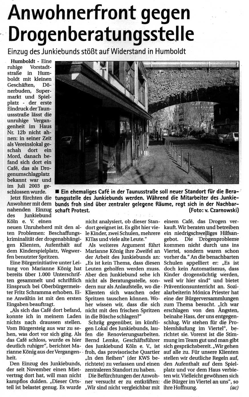 Jetzt fürchten die Anwohner mit dem nahenden Einzug des Junkie Bund Köln e. V. einen neuen Unruheherd mit den alten Problemen: Beschaffungskriminalität der drogenabhängigen Klienten, Aufenthalt auf dem Kinderspielplatz, wegwerfen benutzter Spritzen.