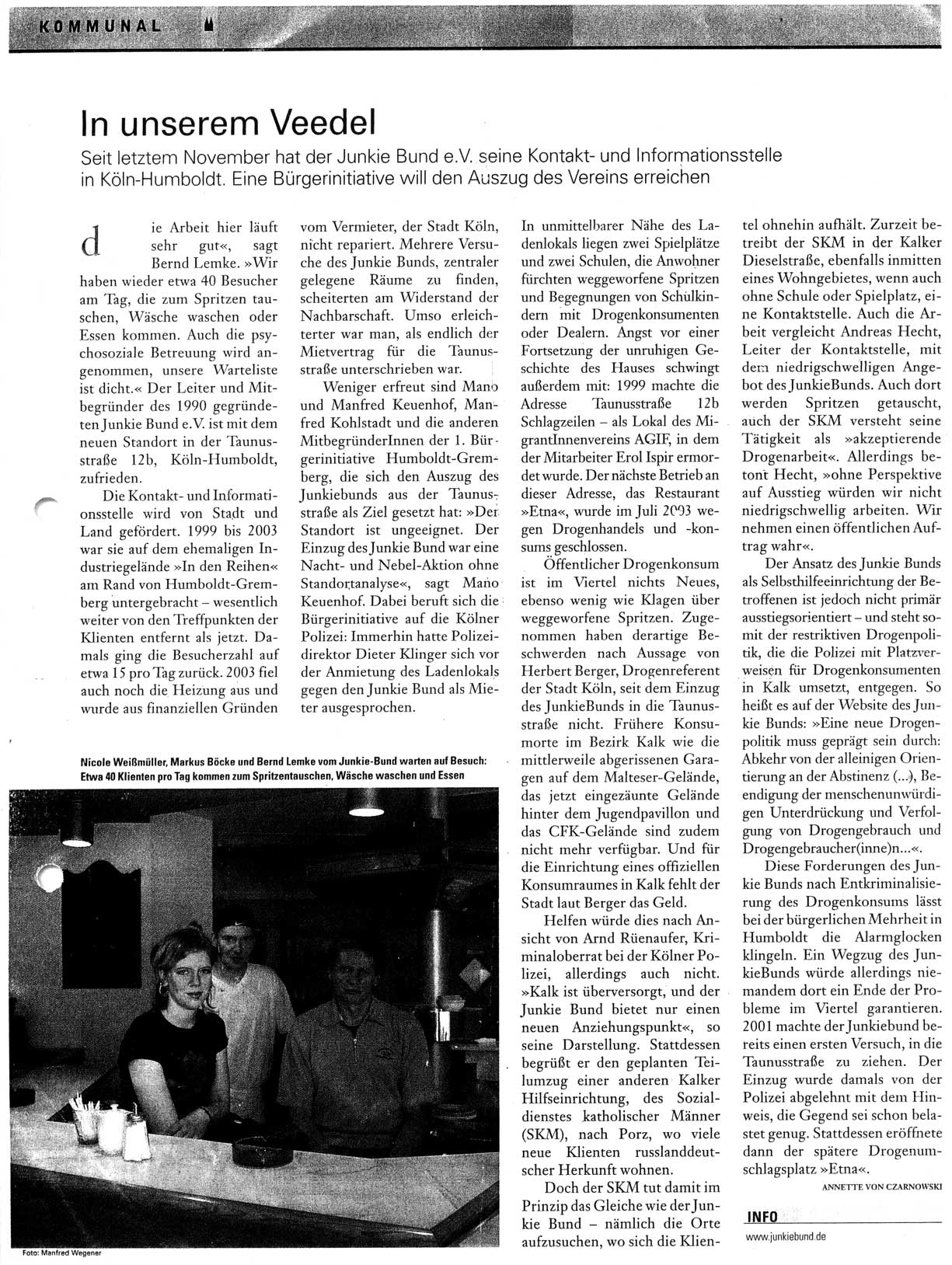 Weniger erfreut sind Mano und Manfred Keuenhof, Manfred Kohlstadt und die anderen Mitbegründerinnen der 1. Bürgerinitiative Humboldt-Gremberg, die sich den Auszug des Junkie Bunds aus der Taunus: Straße als Ziel gesetzt hat: »Der Standort ist ungeeignet. Der Einzug des Junkie Bund war eine Nacht und Nebel-Aktion ohne Standottanalyse«, sagt Mario Keuenhof. Dabei beruft sich die Bürgerinitiative auf die Kölner Polizei: Immerhin hatte Polizeidirektor Dieter Klinger sich vor der Anmietung des Ladenlokals gegen den Junkie Bund als Mieter ausgesprochen.