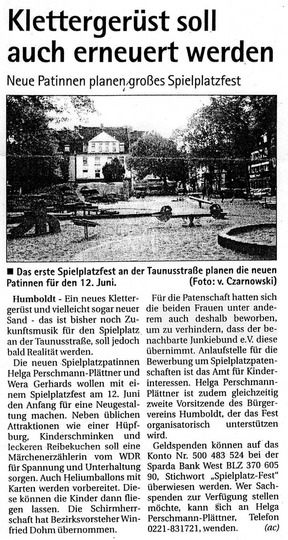 Die neuen Spielplatzpatinnen Helga Perschmann-Plättner und Wera Gerhards wollen mit einem Spielplatzfest am 12. Juni den Anfang für eine Neugestaltung machen. Neben üblichen Attraktionen wie einer Hüpfburg, Kinderschminken und leckeren Reibekuchen soll eine Märchenerzählerin vom WDR für Spannung und Unterhaltung sorgen. Auch Heliumballons mit Karten werden vorbereitet. Diese können die Kinder dann fliegen lassen. Die Schirmherrschaft hat Bezirksvorsteher Winfried Dohm übernommen.