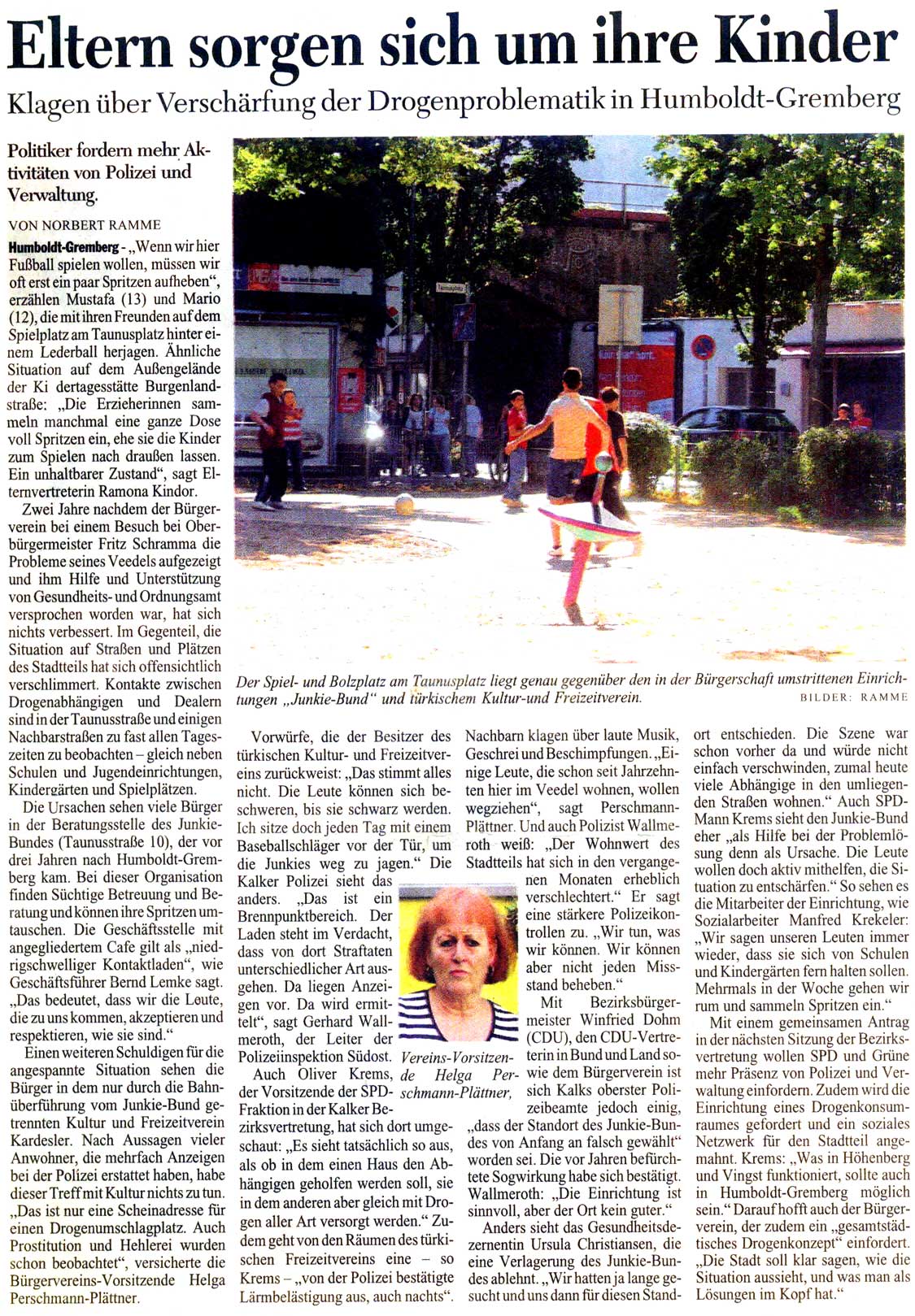 Humboldt-Gremberg – „Wenn wir hier Fußball spielen wollen, müssen wir oft erst ein paar Spritzen aufheben“, erzählen Mustafa (13) und Mario (12), die mit ihren Freunden auf dem Spielplatz am Taunusplatz hinter einem Lederball herjagen. Ähnliche Situation auf dem Außengelände der Kindertagesstätte Burgenlandstraße: „Die Erzieherinnen sammeln manchmal eine ganze Dose voll Spritzen ein, ehe sie die Kinder zum Spielen nach draußen lassen. Ein unhaltbarer Zustand“, sagt Elternvertreterin Ramona Kindor.