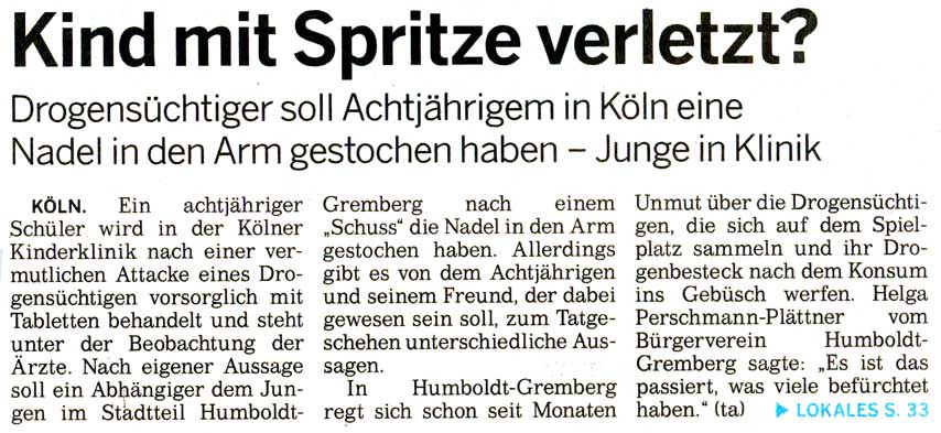 KÖLN. Ein achtjähriger Schüler wird in der Kölner Kinderklinik nach einer vermutlichen Attacke eines Drogensüchtigen vorsorglich mit Tabletten behandelt und steht unter der Beobachtung der Ärzte. Nach eigener Aussage soll ein Abhängiger dem Jungen im Stadtteil Humboldt-Gremberg nach einem „Schuss“ die Nadel in den Arm gestochen haben. Allerdings gibt es von dem Achtjährigen und seinem Freund, der dabei gewesen sein soll, zum Tatgeschehen unterschiedliche Aussagen.