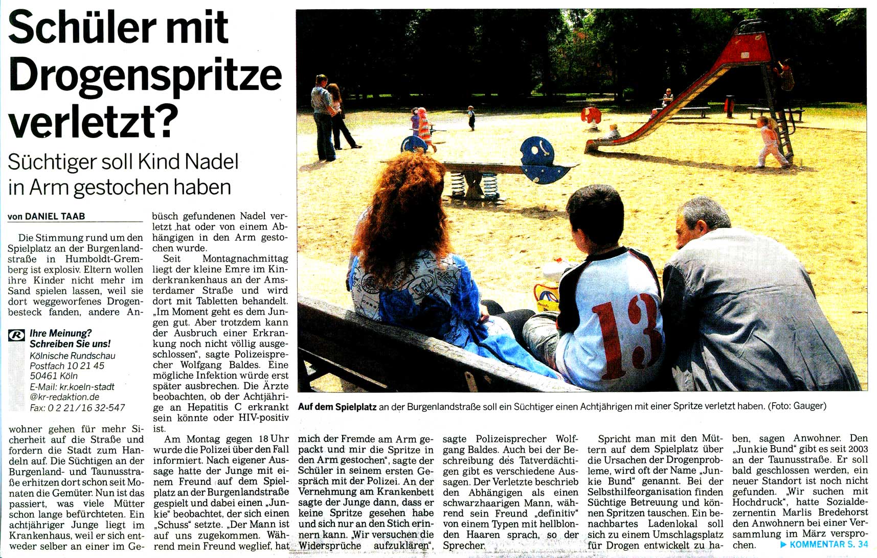 Die Stimmung rund um den Spielplatz an der Burgenlandstraße in Humboldt-Gremberg ist explosiv. Eltern wollen ihre Kinder nicht mehr im Sand spielen lassen, weil sie dort weggeworfenes Drogenbesteck fanden, andere Anwohner gehen für mehr Sicherheit auf die Straße und fordern die Stadt zum Handeln auf. Die Süchtigen an der Burgenland- und Taunusstraße erhitzen dort schon seit Monaten die Gemüter. Nun ist das passiert, was viele Mütter schon lange befürchteten. Ein achtjähriger Junge liegt im Krankenhaus, weil er sich entweder selber an einer im Gebüsch gefundenen Nadel verletzt .hat oder von einem Abhängigen in den Arm gestochen wurde.