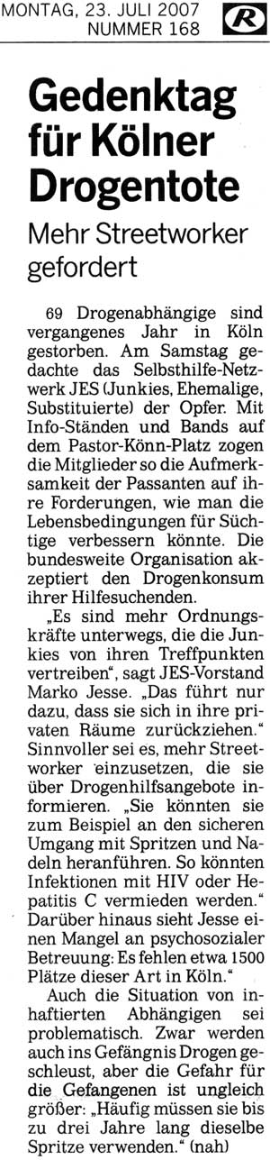 69 Drogenabhängige sind vergangenes Jahr in Köln gestorben. Am Samstag gedachte das Selbsthilfe-Netzwerk JES (Junkies, Ehemalige, Substituierte) der Opfer. Mit Info-Ständen und Bands auf dem Pastor-Könn-Platz zogen die Mitglieder so die Aufmerksamkeit der Passanten auf ihre Forderungen, wie man die Lebensbedingungen für Süchtige verbessern könnte. Die bundesweite Organisation akzeptiert den Drogenkonsum ihrer Hilfesuchenden.