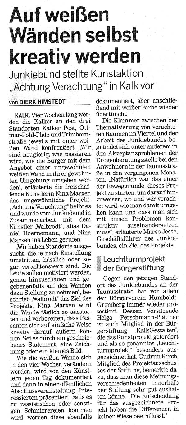 KALK. Vier Wochen lang werden die Kalker an den drei Standorten Kalker Post, Ottmar-Pohl-Platz und Trimbornstraße jeweils mit einer weißen Wand konfrontiert. „Wir sind neugierig, was passieren wird, wie die Bürger mit dem Angebot einer ungewohnten weißen Wand in ihrer gewohnten Umgebung umgehen werden“, erläuterte die freischaffende Künstlerin Nina Marxen das ungewöhnliche Projekt. „Achtung Verachtung“ heißt es und wurde vom Junkiebund in Zusammenarbeit mit dem Künstler „Walbrodt“, alias Daniel Hoernemann, und Nina Marxen ins Leben gerufen.
