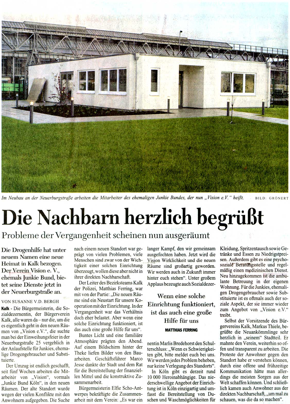 Der Umzug ist endlich geschafft, seit fünf Wochen arbeiten die Mitarbeiter von „Vision“, vormals „Junkie Bund Köln“, in den neuen Räumen. Der alte Standort wurde wegen der vielen Konflikte mit den Anwohnern aufgegeben. Die Suche nach einem neuen Standort war geprägt von vielen Problemen, viele Menschen sind zwar von der Wichtigkeit einer solchen Einrichtung überzeugt, wollen diese aber nicht in ihrer direkten Nachbarschaft.