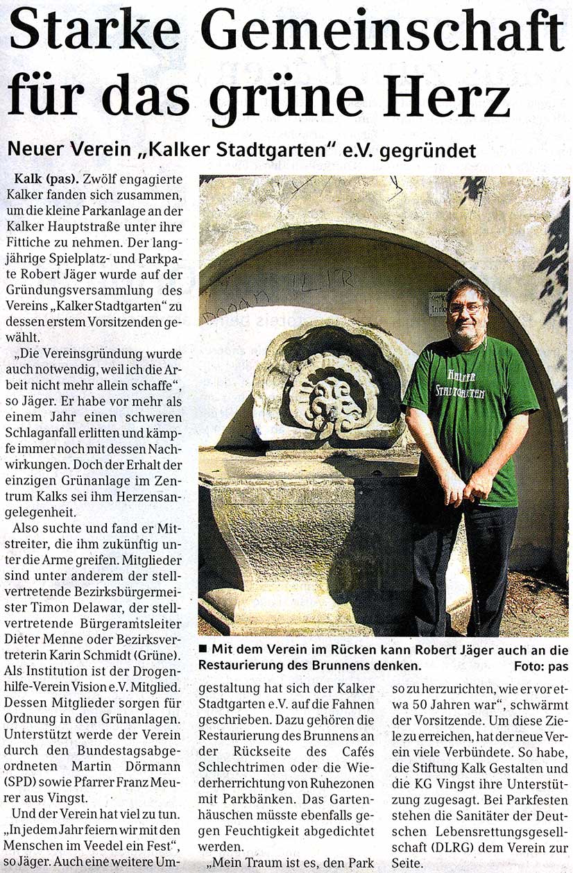 „Die Vereinsgründung wurde auch notwendig, weil ich die Arbeit nicht mehr allein schaffe“, so Jäger. Er habe vor mehr als einem Jahr einen schweren Schlaganfall erlitten und kämpfe immer noch mit dessen Nachwirkungen. Doch der Erhalt der einzigen Grünanlage im Zentrum Kalks sei ihm Herzensangelegenheit.