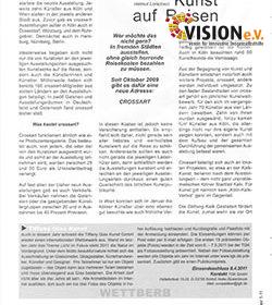 Auf der Internetseite (www.crossart.ning.com) werden die Aktivitäten von crossart übersichtlich dokumentiert. Die Reaktionen der bisher beteiligten Künstler sind durchweg positiv. Auch wenn der eine oder die andere mehr Verkäufe erhofft hätte.