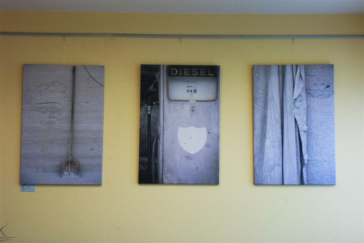 … entstanden in einem maroden Schotterwerk im Schwarzwald, noch halbwegs intakt, aber wohl dem Untergang geweiht. Hier herrscht eine Atmosphäre zwischen Zerfall und trotzigem „Jetzt erst recht“. Die unbearbeiteten Fotos: ein eingestaubter Kittel, eine rostige Schaufel und eine nostalgische Zapfsäule entfalten eine eigene Ästhetik, auf die der Betrachter liebevoll, wehmütig, amüsiert oder abschätzig reagieren mag.