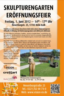 Wir laden ein zu einer großen Eröffnungsfeier, auf der die meisten Künstler anwesend sein werden und die darüber hinaus Vorführungen und Mitmachaktionen anbieten. Aus diesem Anlass wird der Skulpturengarten als Begegnungsstätte den Kalker Bürgern und Drogengebraucher übergeben.