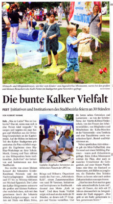 Das reichte von einem kleinen Konzert der bekannten Kinder-Rockband Pelemele und den Nachwuchsgruppen Kalkbrand und ET bis zu Mitsing-Aktionen mit Michael Eppenich. Der Leiter des Kalker Bürgeramtes animierte die großen und kleinen Festbesucher mehrfach dazu, sich mit ihm gemeinsam durch das bekannte kölsche Liedgut zu singen – vor allem mit Titeln von Black Fööss, Brings und Höhnern. Organisiert wurde das Fest vom „Arbeitskreis Kalk“, einem Zusammenschluss von rund 50 Vereinen, Initiativen und Institutionen im Stadtbezirk -diesmal zum Motto „Kalk ist bunt“. Und diese bunte Vielfalt zeigte sich auch an den mehr als 30 Ständen, an denen sich 27 Gruppen und Vereine vorstellten. Und die boten neben Getränken und Leckereien – so von der Schülerfirma der Martin-Köllen-Förder-schule, von den Frauen der Arbeiterwohlfahrt, von Mitgliedern und Mitarbeitern der Kuba-Moschee an der Vietorstraße – eine Tombola und eine Tauschbörse sowie verschiedene Spiel-, Bastel- und Mal-Aktionen an.