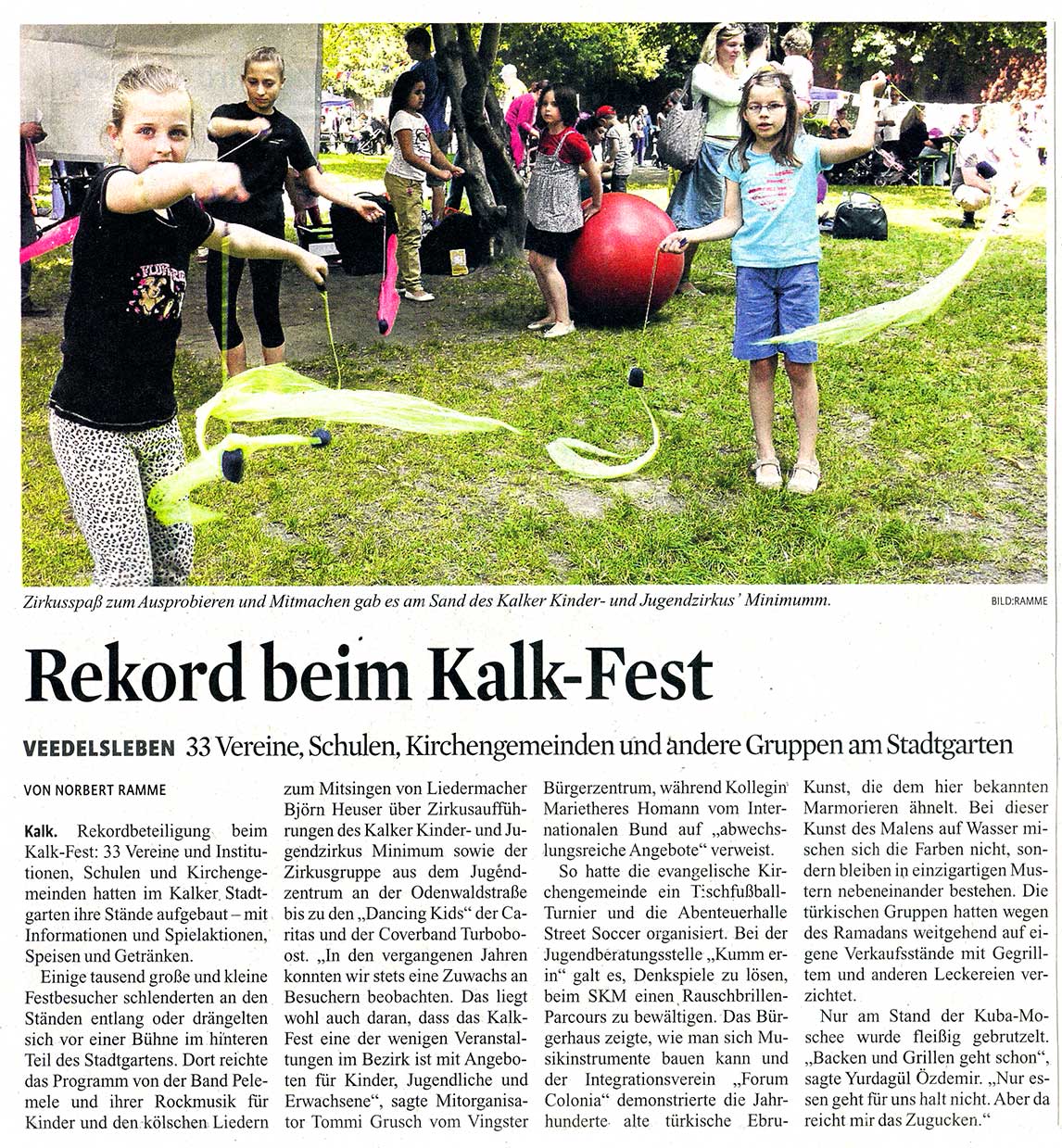 Einige tausend große und kleine Festbesucher schlenderten an den Ständen entlang oder drängelten sich vor einer Bühne im hinteren Teil des Stadtgartens. Dort reichte das Programm von der Band Pelemele und ihrer Rockmusik für Kinder und den kölschen Liedern zum Mitsingen von Liedermacher Björn Heuser über Zirkusaufführungen des Kalker Kinder- und Jugendzirkus Minimum sowie der Zirkusgruppe aus dem Jugendzentrum an der Odenwaldstraße bis zu den „Dancing Kids“ der Caritas und der Coverband Turboboost. „In den vergangenen Jahren konnten wir stets eine Zuwachs an Besuchern beobachten. Das liegt wohl auch daran, dass das Kalk-Fest eine der wenigen Veranstaltungen im Bezirk ist mit Angeboten für Kinder, Jugendliche und Erwachsene“, sagte Mitorganisator Tommi Grusch vom Vingster Bürgerzentrum, während Kollegin Marietheres Homann vom Internationalen Bund auf „abwechslungsreiche Angebote“ verweist.