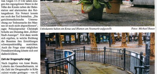 48 Menschen sind in Köln 2015 an den Folgen des Drogenkonsums gestorben. Mit Mahnwachen und Infoständen am Neumarkt und anderen Brennpunkten machte am „Internationalen Gedenktag für verstorbene Drogengebraucher“ der Verein für innovative Drogenselbsthilfe Vision auf eine nach seiner Ansicht gescheiterte Drogenpolitik aufmerksam. „Die bisherige Politik mit ihrem Fokus auf Repression, Strafverfolgung und einem unrealistischen Abstinenzanspruch ist gescheitert“, meint Geschäftsführer Marco Jesse. Drogen gebe es trotz Verbots überall – sogar in Haftanstalten.