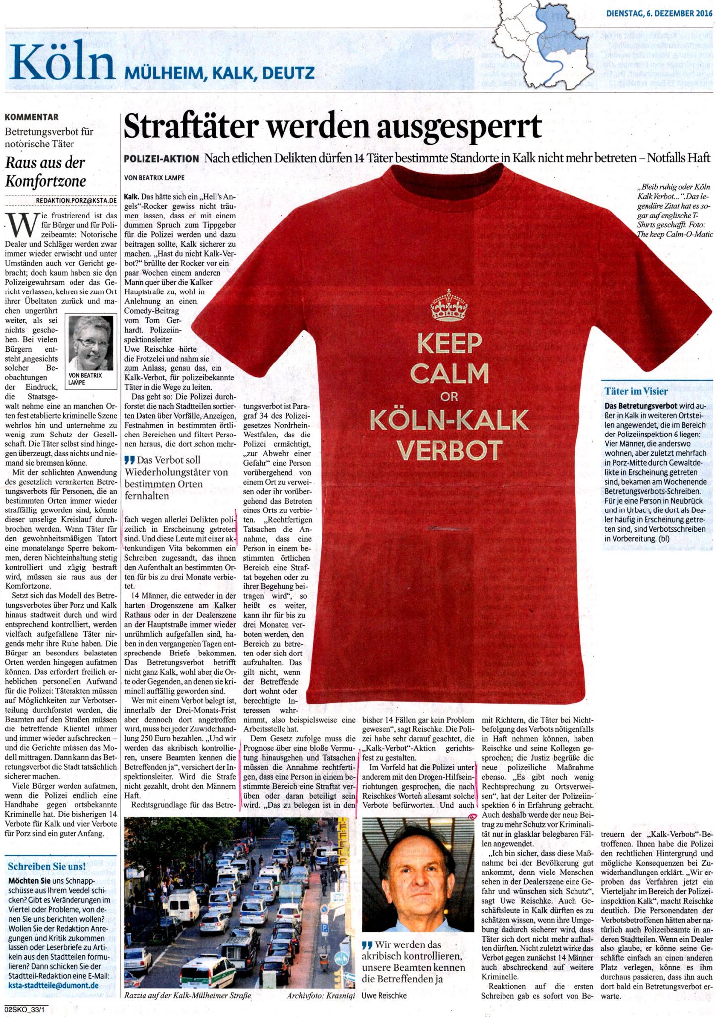 „Ich bin sicher, dass diese Maßnahme bei der Bevölkerung gut ankommt, denn viele Menschen sehen in der Dealerszene eine Gefahr und wünschen sich Schutz“, sagt Uwe Reischke. Auch Geschäftsleute in Kalk dürften es zu schätzen wissen, wenn ihre Umgebung dadurch sicherer wird, dass Täter sich dort nicht mehr aufhalten dürften. Nicht zuletzt wirke das Verbot gegen zunächst 14 Männer auch abschreckend auf weitere Kriminelle.