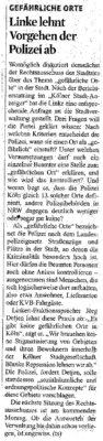 Gefährliche OrteWomöglich diskutiert demnächst der Rechtsausschuss des Stadtrats über das Thema „gefährliche Orte“ in der Stadt. Nach der Berichterstattung im „Kölner Stadt-Anzeiger“ hat die Linke eine entsprechende Anfrage an die Stadtverwaltung gestellt. Drei Fragen will die Partei geklärt wissen: Nach welchen Kriterien entscheidet die Polizei, wann sie einen Ort als „gefährlich“ einstuft? Unter welchen Voraussetzungen darf auch ein einzelner Beamter eine Stelle zum „gefährlichen Ort“ erklären, und wie wird das kontrolliert? Und woran liegt es, dass die Polizei Köln gleich 13 solcher Orte definiert, andere Polizeibehörden in NRW dagegen deutlich weniger oder sogar gar keine?