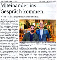 Miteinander ins Gespräch kommenKalk (kg). Bereits im Vorjahr hatte die Bezirks Vertretung (BV) Kalk Beschlüsse für einen Drogenkonsumraum geschafft. Nach der jüngsten Ratssitzung rückt ein solches Hilfsangebot im Stadtteil Kalk nun näher. Dem Papier zufolge soll kurzfristig gesucht und angemietet werden. Die Einplanung zusätzlicher Gelder ist ab dem Haushaltsjahr 2019 vorgesehen.