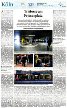 Tristesse am FriesenplatzDie Zwischenebene der U-Bahnhaltestelle hat sich zum linksrheinischen Hotspot der Drogenszene entwickelt. Bei schönem Wetter verlagert sich der Treffpunkt auf den oberirdischen Platz. Viele Passanten fühlen sich verunsichert. Die vielen leerstehenden Geschäfte verschärfen das Problem