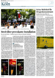 „Sie spritzt, Er spritzt (Konsumfreiraum)“ ist der Titel der Installation, die die beiden Wiener Künstler Alexandra Berlinger und Martin Wagner im Rahmen des Impulse Theater-Festivals entwickelten und die zu dem vierteiligen Kunstprojekt „Angstraum Köln“ gehört. Die Idee sorgte sogleich für heftigen Gegenwind. Die Bürgerinitiative Zukunft Neumarkt, ein Aktionsbündnis von Geschäftsleuten und Anwohnern gegen den am Neumarkt geplanten Drogenkonsumraum, fragte sogleich provokant: „Ist das Kunst oder kann das weg?“ Guido Köhler, Vorsitzender der Bürgerinitiative, zeigt sich entsetzt.„Das ist eine Verherrlichung und Verharmlosung von Heroin und anderen harten Drogen, die an die Grenzen dessen stößt, was man ertragen kann.“ Hier werde Kunst auf dem Rücken der Abhängigen gemacht mit dem politischen Ziel, Drogen zu legalisieren. Auch Reissdorf distanzierte sich von der Aktion und kündigte an, einen Anwalt einzuschalten. Gesundheitsdezernent Harald Rau dagegen, der sich seit Jahren für die Einrichtung eines Drogenkonsumraums in Neumarkt-Nähe einsetzt, unterstützt das Projekt. „Ich freue mich, dass auch Kulturschaffende das problematische Thema »öffentlicher Drogenkonsum« aufgreifen und es so einmal aus ganz anderer Perspektive in der Stadtgesellschaft sichtbar wird“, sagte er dem „Express“.