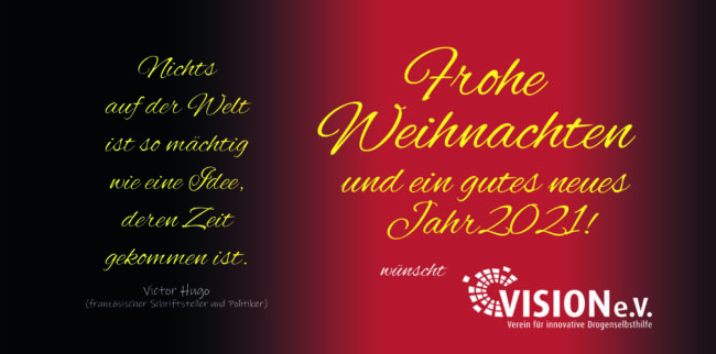 Wir bedanken uns für die oftmals langjährige Unterstützung und wir freuen uns über weitere Jahre der Kooperation und Verbundenheit mit euch. Der Vorstand, die neue Leitung und das Team von VISION e.V. wünschen euch eine friedvolle Weihnachtszeit und Erholung im Kreise eurer Lieben. Für das neue Jahr viel Kraft und Erfolg und auf ein baldiges Wiedersehen und Kennenlernen.