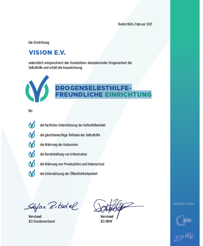 Verliehen durch den JES Bundesverband e.V. und JES NRW e.V. haben wir als VISION e.V. das Zertifikat „DROGENSELBSTHILFE-FREUNDLICHE EINRICHTUNG“ erhalten, was uns persönlich sehr stolz macht und wofür wir uns bedanken möchten.