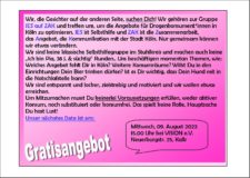Wir suchen Dich! Wir gehören zur Gruppe JES auf ZAK und treffen uns, um die Angebote für Drogenkonsument*innen in Köln zu optimieren. JES ist Selbsthilfe und ZAK ist die Zusammenarbeit, das Angebot, die Kommunikation mit der Stadt Köln. Nur gemeinsam können wir etwas verändern. Wir sind keine klassische Selbsthilfegruppe im Stuhlkreis und machen auch keine „Ich bin Pia, 38 Jahre & süchtig“ Runden.. Uns beschäftigen momentan Themen, wie: