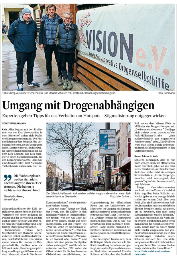 Das Streetwork Angebot von VISION e.V. teilt sich in zwei Bereiche. Zum einen gibt es eine Kooperation mit der Stadt Köln und anderen Drogenhilfeträgern, das Aufsuchende Sucht Clearing, kurz ASC genannt. Hier sind die beiden Streetworker*innen von VISION e.V. beteiligt und betreuen die Szeneplätze kölnweit. Der zweite Bereich ist das VISION interne Streetwork, das wir zwei mal die Woche anbieten. Hierzu nutzen wir einen für Streetwork ausgestatteteten Bulli und fahren die rechtsrheinischen Szeneplätze ab. Zum Angebot zählen nicht nur Spritzentausch sondern auch Beratung und Vermittlung, die direkt vor Ort im Bulli stattfinden kann. Viele Nutzer*innen sind nicht am Hilfsystem angebunden und können nur durch Streetworkangebote erreicht werden. Das bedeutet in erster Linie auch Kontaktarbeit, Kontakte herstellen und pflegen.