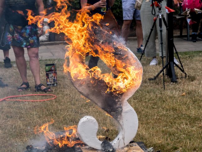 In Form eines Paragraphen-Symbols wird symbolisch durch die Verbrennung die Abschaffung des Betäubungsmittelgesetzes in der heutigen Form gefordert. Dies war der letzte Programmpunkt und ein effektvoller Ausklang des Internationalen Gedenktags für verstorbene Drogengebrauchende am...