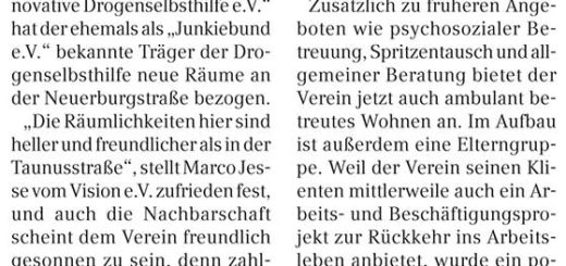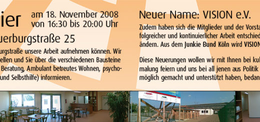 Junkiebund bezog als Vision neue Räume Kalk (ac). Unter dem neuen Namen „Vision Verein für innovative Drogenselbsthilfe e.V.“ hat der ehemals als „Junkiebund e.V.“ bekannte Träger der Drogenselbsthilfe neue Räume an der Neuerburgstraße bezogen....