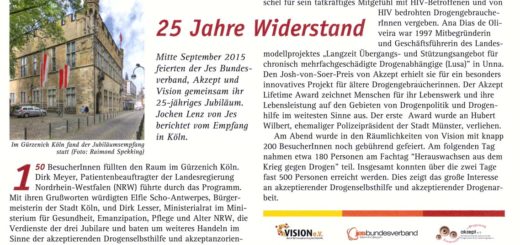 25 Jahre Widerstand Mitte September 2015 feierten der Jes Bundesverband, Akzept und Vision gemeinsam ihr 25-jähriges Jubiläum. Jochen Lenz von Jes berichtet vom Empfang in Köln. 150 Besucherinnen füllten den Raum im Gürzenich Köln....