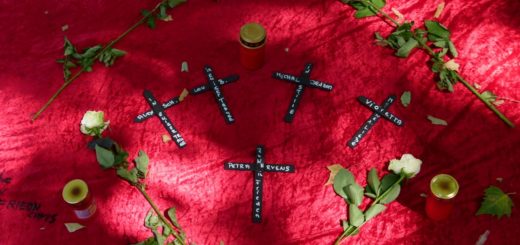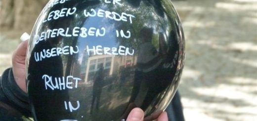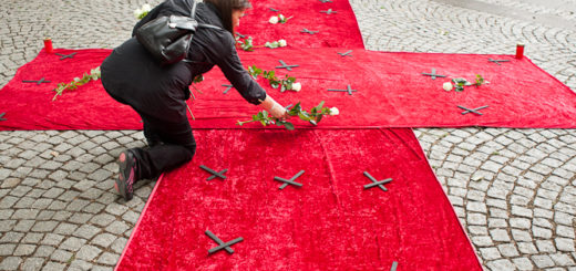 Eine Menschentraube lässt schwarze Ballons in den Himmel steigen. Im Hintergrund liegt ein rotes Kreuz aus Samt auf dem Asphalt. Es ist von Grablichtern, weißen Rosen und Blättern bedeckt, die erschreckende Fakten aufzeigen. Köln....