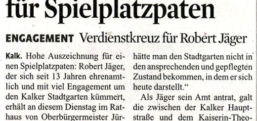 Hohe Auszeichnung für Spielplatzpaten Engagement – Verdienstkreuz für Robert Jäger Kalk. Hohe Auszeichnung für einen Spielplatzpaten: Robert Jäger, der sich seit 13 Jahren ehrenamtlich und mit viel Engagement um den Kalker Stadtgarten kümmert, erhält...