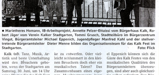 Am 2.7.2011 veranstaltete der Arbeitskreis Kalk bzw. das Bürgerzentrum Vingst im Kalker Stadtgarten das KalkFest, bei dem sich 30 Einrichtungen, Vereine und Institutionen mit Aktions- und Mitmachständen präsentierten. Entsprechend dem Motto „Kalk am Ball“...