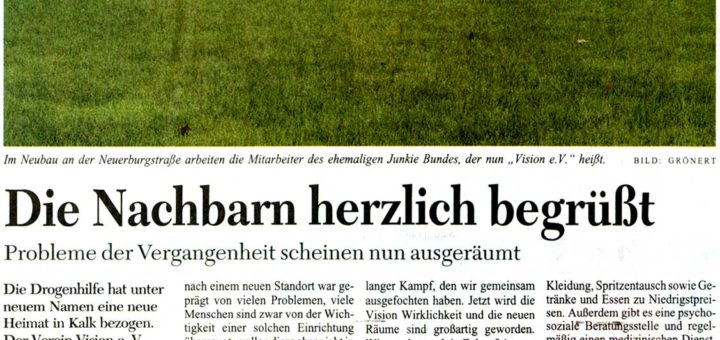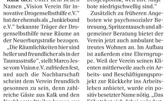 Probleme der Vergangenheit scheinen nun ausgeräumt Die Drogenhilfe hat unter neuem Namen eine neue Heimat in Kalk bezogen. Der Verein Vision e. V., ehemals Junkie Bund, bietet seine Dienste jetzt in der Neuerburgstraße an....