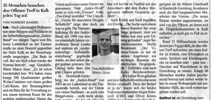 Junkie Bund heißt jetzt Vision – Umzug an die Neuerburgstraße sorgt für Erleichterung Von JÖRG FLEISCHER KALK. Es riecht neu und unverbraucht an der Neuerburgstraße 25. Die Wände sind frisch gestrichen, die Möbel neu,...