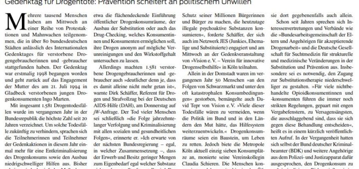 Ein Artikel zum internationalen Gedenktag für verstorbene Drogengebraucher*innen 2021. Quelle: Junge Welt Nr. 168 vom 23.07.2021