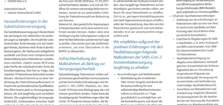 Ein Positionspapier zur Sars-Cov-2 Arzneimittelversorgungsverordnung für eine adäquate, medizinische Versorgung für Patientinnen mit Opiadabhängigkeit.
