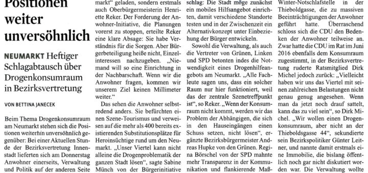 Positionen weiter unversöhnlich NEUMARKT Heftiger Schlagabtausch über Drogenkonsumraum in Bezirksvertretung VON BETTINA JANECEK Beim Thema Drogenkonsumraum am Neumarkt stehen sich die Positionen weiterhin unversöhnlich gegenüber: Bei einer Aktuellen Stunde der Bezirksvertretung Innenstadt lieferten sich...