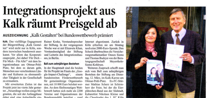 Wir gratulieren der Bürgerstiftung „Kalk Gestalten“ und dem Integrationshaus ganz herzlich zu der Auszeichnung die das Integrationsprojekt „Sei dabei! Für Dich – Für Mich – Für Alle“ erhalten hat. Der mit 10.000,- € dotierte...