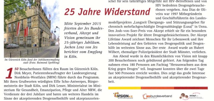 25 Jahre Widerstand Mitte September 2015 feierten der Jes Bundesverband, Akzept und Vision gemeinsam ihr 25-jähriges Jubiläum. Jochen Lenz von Jes berichtet vom Empfang in Köln. 150 Besucherinnen füllten den Raum im Gürzenich Köln....