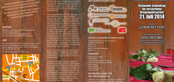Gedenkfeier bei VISION e.V. in Kalk Montag, 21. Juli 2014 ab 15 Uhr bis 16:00 Installation des im Vorfeld erstellten Kreativprojekts 16:00 Ankunft anderer Einrichtungen mit den im Vorfeld beschrifteten Holzscheiben 16:30 Eröffnungsrede Vorstand...