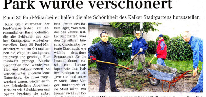 Rund 30 Ford-Mitarbeiter halfen die alte Schönhheit des Kalker Stadtgartens herzustellen Kalk (sf). Mitarbeiter der Ford-Werke haben auf ehrenamtlicher Basis geholfen, die alte Schönheit des Kalker Stadtgartens wiederherzustellen. Etwa 30 Ford-Mitarbeiter waren vor Ort...