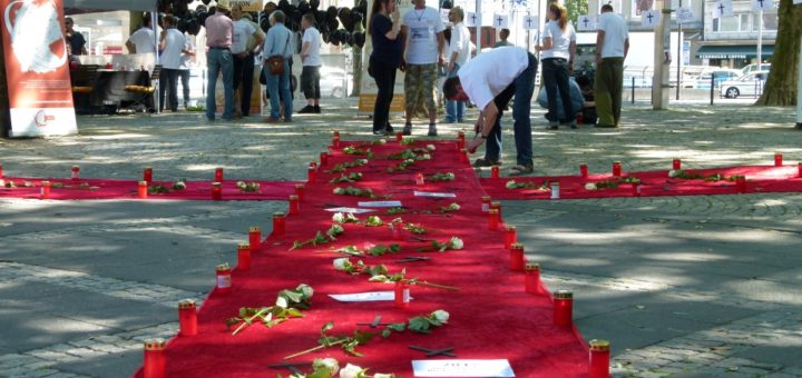 Eine Menschentraube lässt schwarze Ballons in den Himmel steigen. Im Hintergrund liegt ein rotes Kreuz aus Samt auf dem Asphalt. Es ist von Grablichtern, weißen Rosen und Blättern bedeckt, die erschreckende Fakten aufzeigen. Köln....