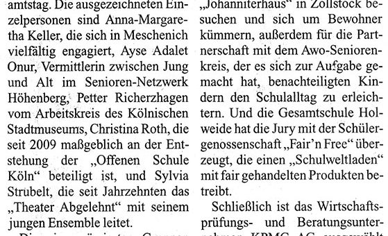 KÖLN ENGAGIERT Urkunden gibt es im September Die Preisträger des Wettbewerbs „Köln engagiert 2013″ stehen fest, die Urkunden erhalten sie am 15. September, dem Kölner Ehrenamtstag. Die ausgezeichneten Einzelpersonen sind Anna-Margaretha Keller, die sich...