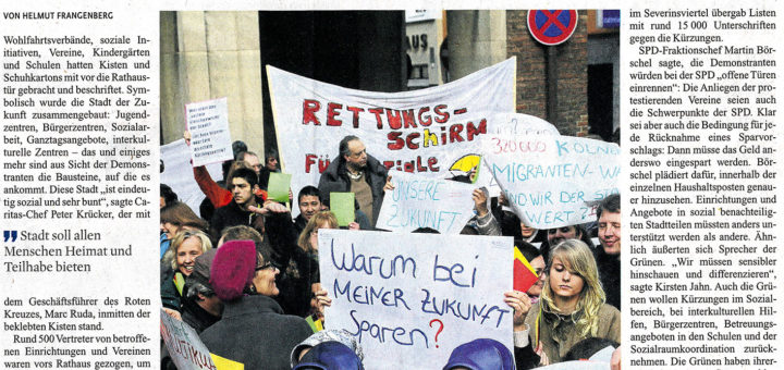 Soziale Institutionen protestierten vor dem Rathaus gegen Einschnitte – Brisanter Sparvorschlag der Grünen VON HELMUTFRANCENBERG Wohlfahrtsverbände, soziale Initiativen, Vereine, Kindergärten und Schulen hatten Kisten und Schuhkartons mit vor die Rathaustür gebracht und beschriftet. Symbolisch...
