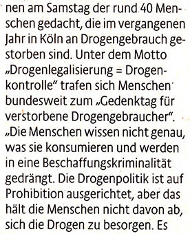 Mit einer Mahnwache auf dem Neumarkt haben die Hinterbliebenen am Samstag der rund 40 Menschen gedacht, die im vergangenen Jahr in Köln an Drogengebrauch gestorben sind. Unter dem Motto „Drogenlegalisierung = Drogenkontrolle“ trafen sich...