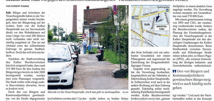 AUSBAUPLÄNE Stadt will gegen den schlechten Zustand angehen – Parkflächen sollen neu geordnet werden VON NORBERT RAMME Kalk. Bürger und Anwohner der Neuerburgstraße haben in der Vergangenheit immer wieder bemängelt, dass der Bürgersteig auf...