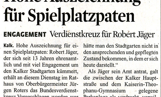 Hohe Auszeichnung für Spielplatzpaten Engagement – Verdienstkreuz für Robert Jäger Kalk. Hohe Auszeichnung für einen Spielplatzpaten: Robert Jäger, der sich seit 13 Jahren ehrenamtlich und mit viel Engagement um den Kalker Stadtgarten kümmert, erhält...
