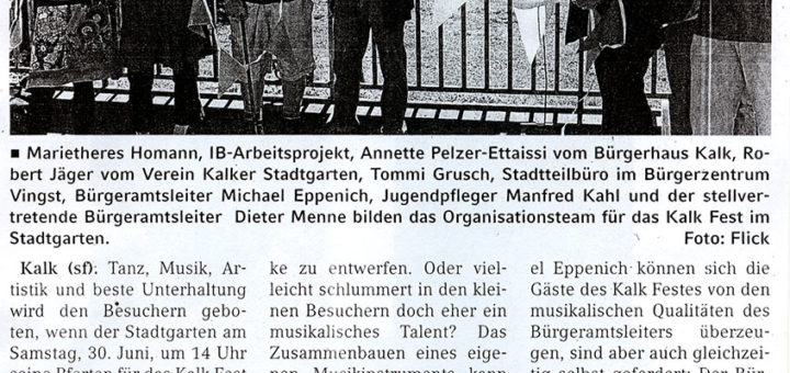 Großes Fest am 30. Juni im Kalker Stadtgarten Kalk (sf) Tanz, Musik, Artistik und beste Unterhaltung wird den Besuchern geboten, wenn der Stadtgarten am Samstag, 30. Juni, um 14 Uhr seine Pforten für das...