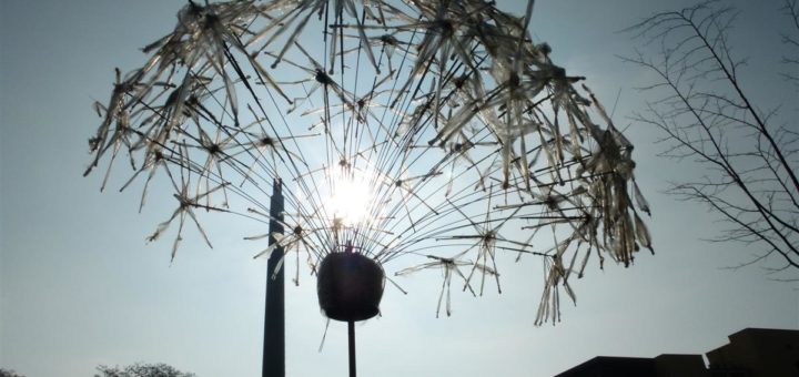 „Pusteblume“ „Wenn Träume den Himmel berühren“ Künstler: Bina Placzek-Theisen (www.bina-art.de) Material: alte Regenschirme, alter Laternenpfahl, „Hopseball“, Bauschaum Abmessungen: 4m Höhe, 4m Durchmesser Herstellungsjahr: 2010
