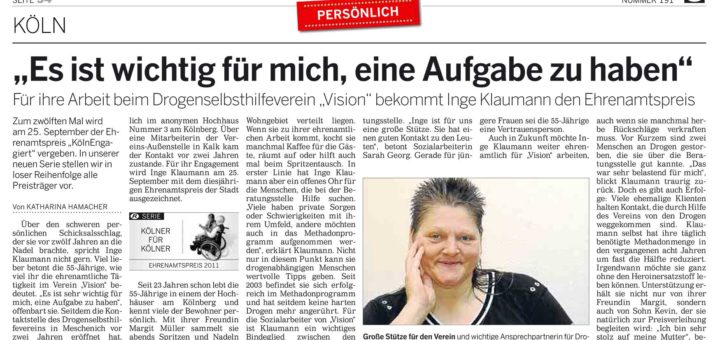 Für ihre Arbeit beim Drogenselbsthilfeverein „Vision“ bekommt Inge Klaumann den Ehrenamtspreis Zum zwölften Mal wird am 25. September der Ehrenamtspreis „KölnEngagiert“ vergeben. In unserer neuen Serie stellen wir in loser Reihenfolge alle Preisträger vor....